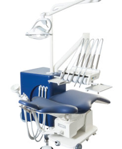 Mobil unit för äldreboenden, skolor och fältkliniker. Med stol, arm, instrumentbrygga, fotkontroll, OP-lampa, röntgen och drivenhet med motor, kompressor och vatten. UnicLine Mobile har samma höga hygienstandard och ergonomi som en stationär unit.